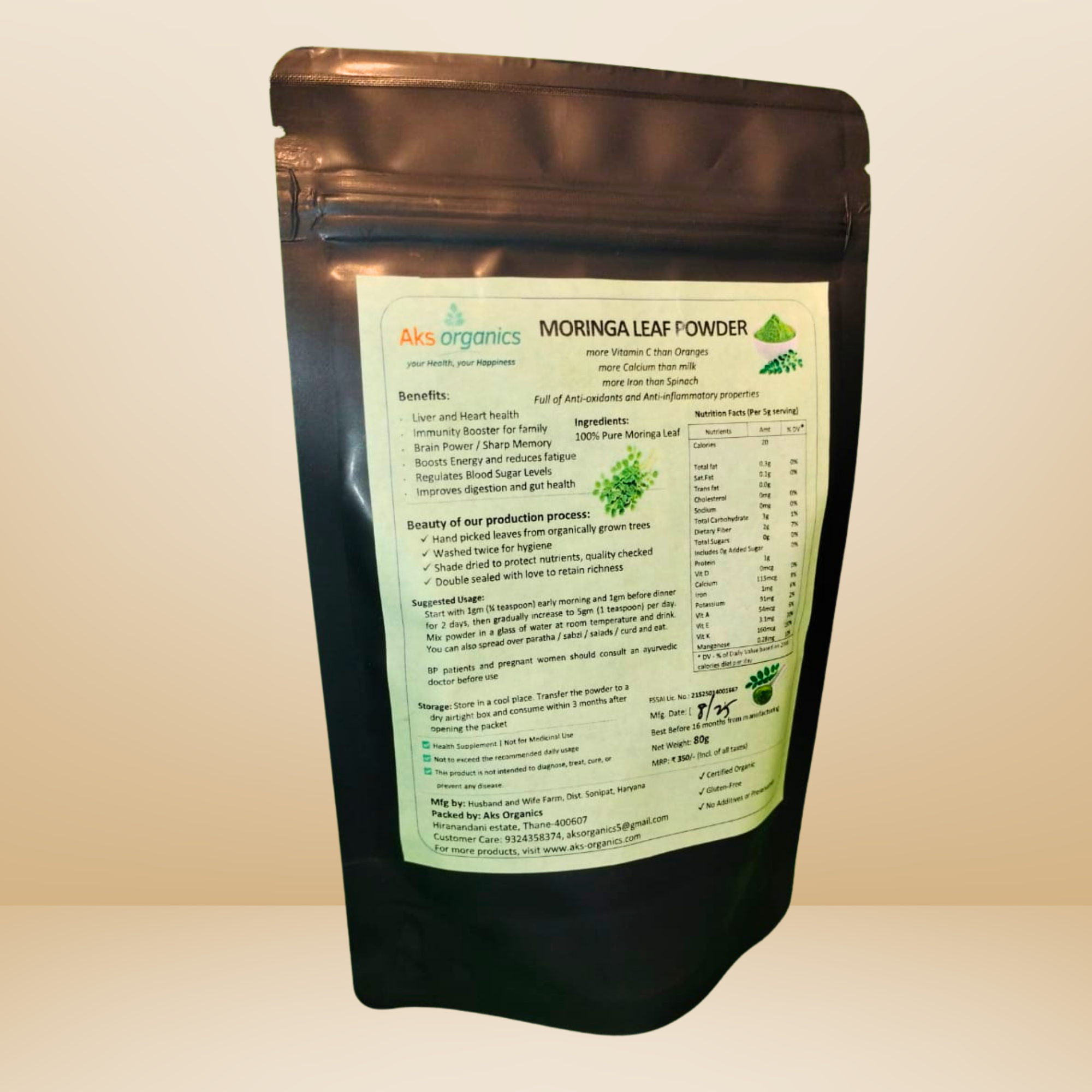 Moringa oleifera is technical name of “Saijan ki phalli” or “Drumstick” tree (also known as Shevga sheng / Shigru / Saragavo) . The leaves of tree are dried and milled to powder form. Nothing else is mixed. It is a nutrient-dense food used to supplement daily nutrition.